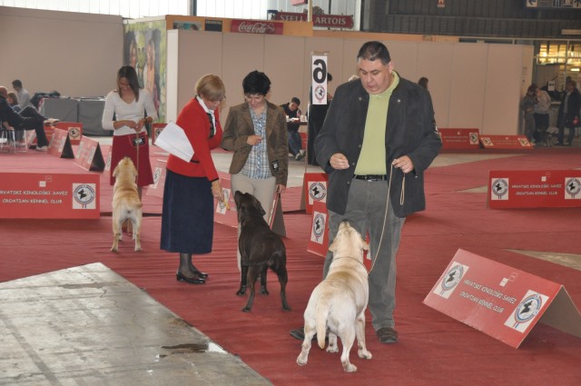 Výstavu v Chorvátskom Zagrebe sme skôr poňali ako výlet,o to viac ma potešilo, keď Fíbí získala v triede pracovnej prvé miesto a tým aj CAC. Hoci po sobotňajšom vystavovaní, som sa chcela baliť domov, nakoľko Fíbí sa absolútne nevedela vystaviť. Zaujímali ju všetky pachy okolo...pripadala mi akoby pracovala na poli a nie behala vo výstavnom kruhu. To sa aj odzrkadlilo na známke VD - zaslúžene. Skúsili sme teda aj nedeľu, to sme vystavovali až o 12 hod, tak sme sa zatiaľ,aby sme sa vyhli výstavnému stresu, prechádzali po krásnom parku a pozerali si historickú časť Zagrebu. Prišli sme na výstavisko tesne pred začiatkom posudzovania psíkov. Fíbí to očividne prospelo, lebo v kruhu sa tento krát predviedla úžasne a talianskej pani rozhodkyni sa veľmi páčila. Čo ma však absolútne prekvapilo,čokoládových labradorov sme obhajovali ešte s jednou fenkou len my dve. Prevládali čierne prevažne od talianskych chovateľov. Hoci pre nás výstavy nie sú prvoradé, potešilo ma, že som mohla prvý krát vystavovať, v tak veľkých kruhoch. Konečne sa mi nikto pri vystavovaní netlačil na chrbát. Organizačne bola výstava na veľmi dobrej úrovni, haly boli čisté, vyhradené miesto na venčenie sa pravidelne čistilo, vedľa v hale, kde sme vystavovali prebiehali exibície záchranárskych psov, agility, program pre najmenších...Keď k tomu pridám ubytovanie v príjemnom hoteli, s ďalšími 25 psíkmi !!! tak to hodnotím ako veľmi príjemný výlet. Cesta bola úžasná, dialnice prázdne, počastie príjemné, šťastne sme docestovali domov. Nedá mi znova nepoďakovať mojej rodinke, ktorá nám fandila na diaľku,a hlavne môjmu manželovi, ktorý každú situáciu komentoval svojským humorom...Fakt príjemný zážitok !