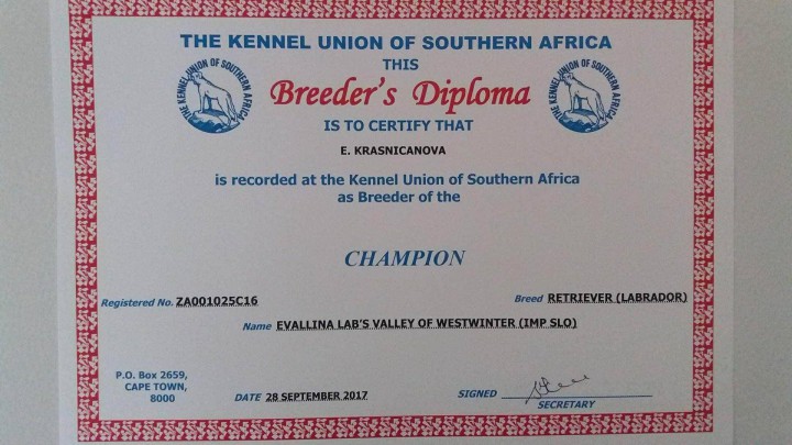 Obrovská vďaka patrí Bronwyn Westerdale majiteľke fenky Evallina Lab´s Valley, ktorá po dvoch rokoch v ďalekej Afrike vybehala s Erin titul Juoafrický show šampión. O to viac ma teší to, že Bronwyn nie je len krásna a zdravá ale aj šikovná, čo dokazujú aj jej krásne úspechy v pracovných súťažiach. V roku 2016 sa stala držiteľkou ocenenia Gundog v provicii Porth Elizabeth.